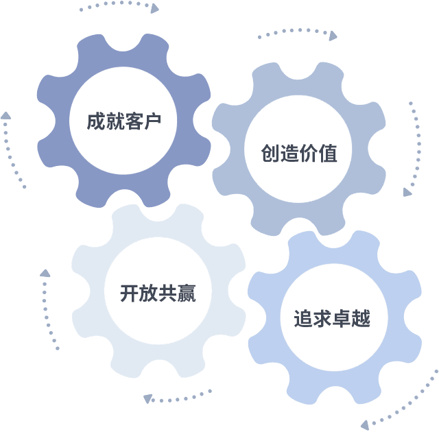 成就客户是一切决策的出发点,,,,创造价值是衡量所有工作的标准,,,,追求卓越是我们做事做人的态度,,,,开放共赢是我们的格局也是最终的结果。。。。价值观的齿轮环环相扣,,推动着组织里的每个人不断向前。。。