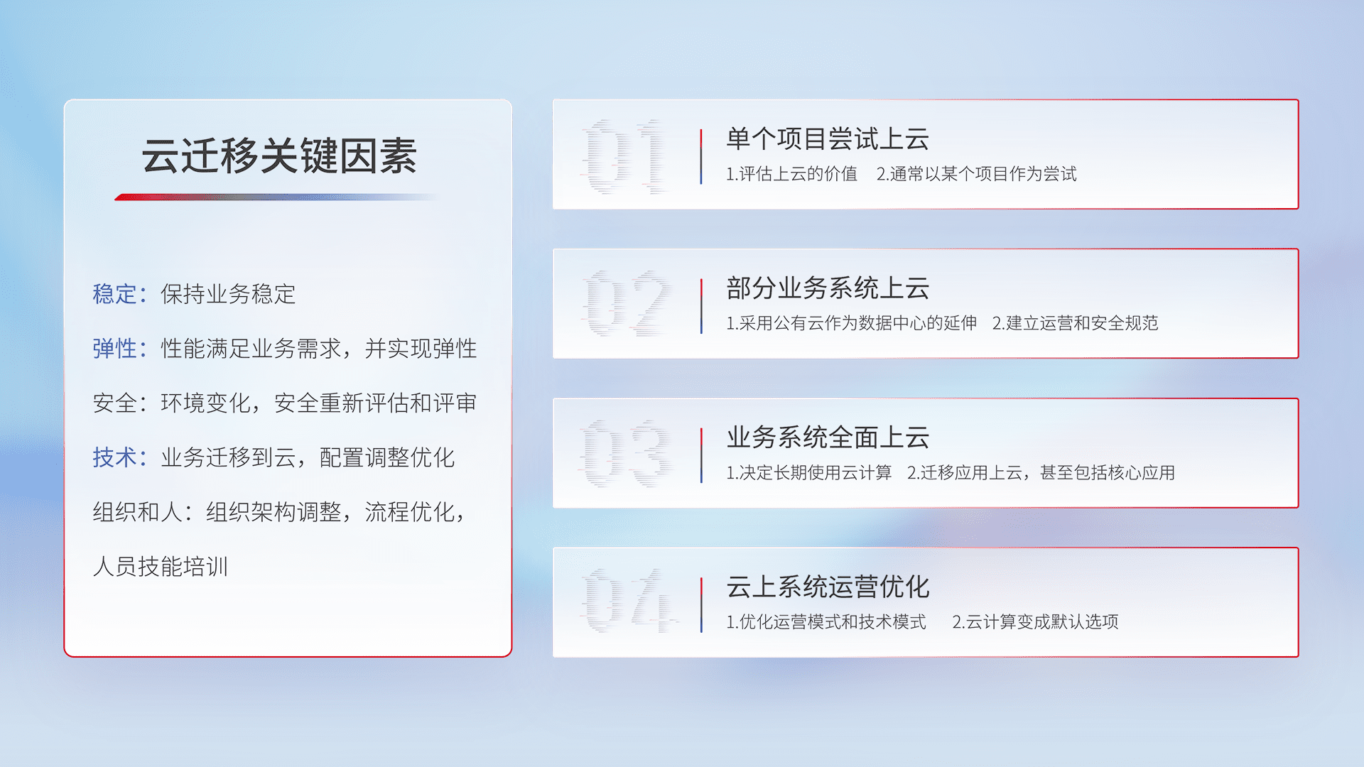 结合实际业务,,从规划设计、、云平台选型、、、、云原生改造、、、数据迁移、、、集成交付,,迁移全过程为客户识别最佳上云路径,,做好风险识别管理,,设计网络架构、、、、身份权限、、、安全审计合规、、、操作审计、、日志审计、、、监控告警策略、、、多站点容灾设计等,,对云上基础设施进行整体规划,,,,提升IT治理水平,,,以满足弹性、、、高可用、、、、高性能的需求。。。