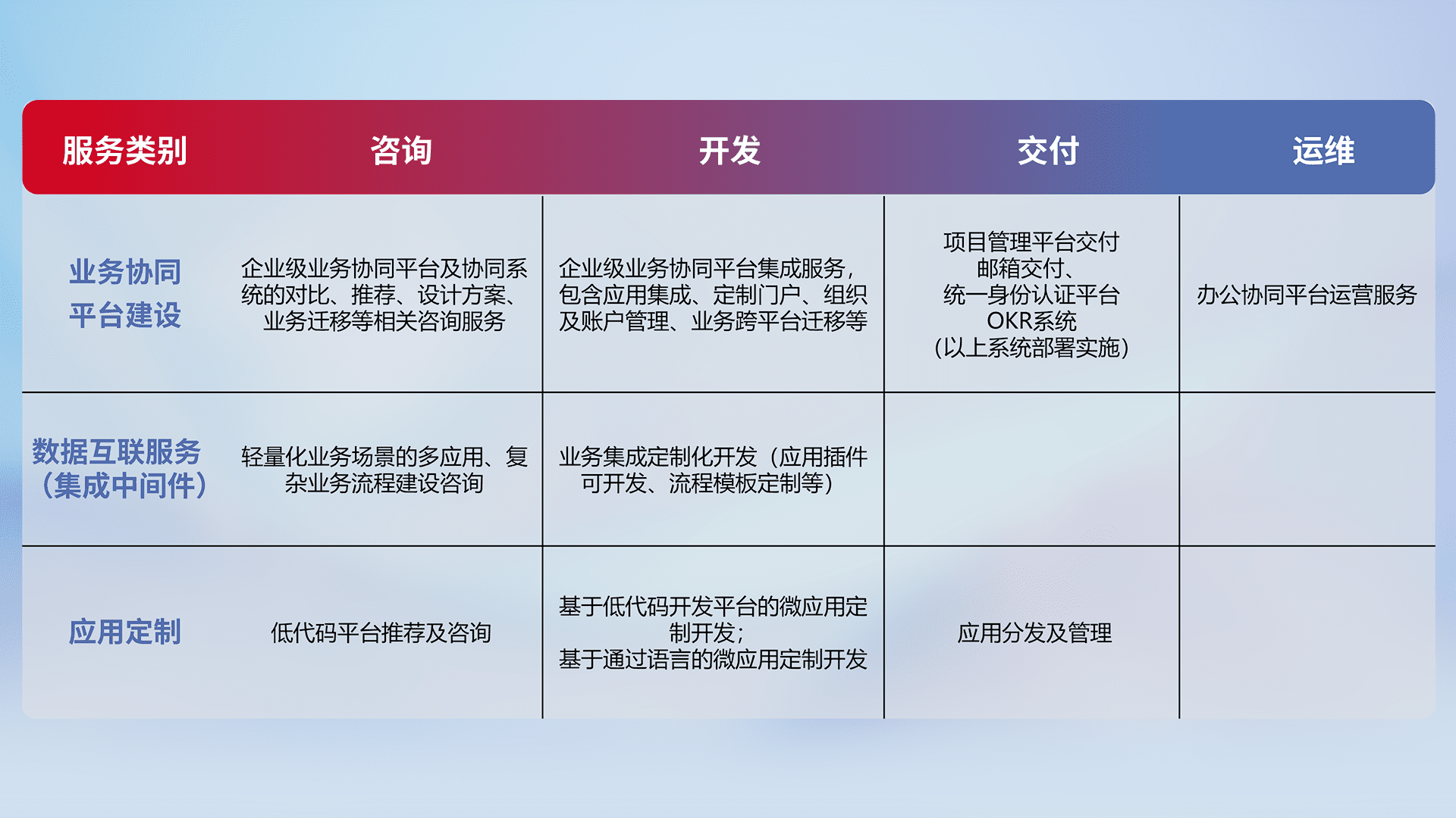 针对钉钉、、、企微、、IDaas等平台级产品提供产品的规划、、方案、、交付、、定制化开发等服务,,实现如统一协同办公、、智能客户服务、、、混合会议管理、、、、智能数据查询、、、、等业务场景,,,实现数字化转型。。